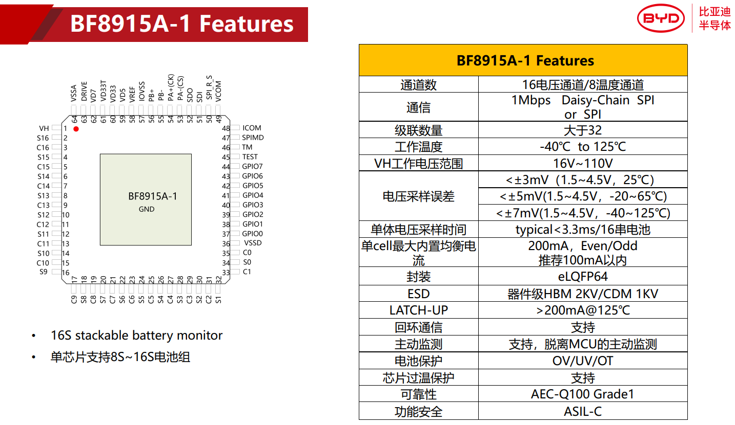 - 单颗芯片最大可以测量 16 节串联锂离子电池电压