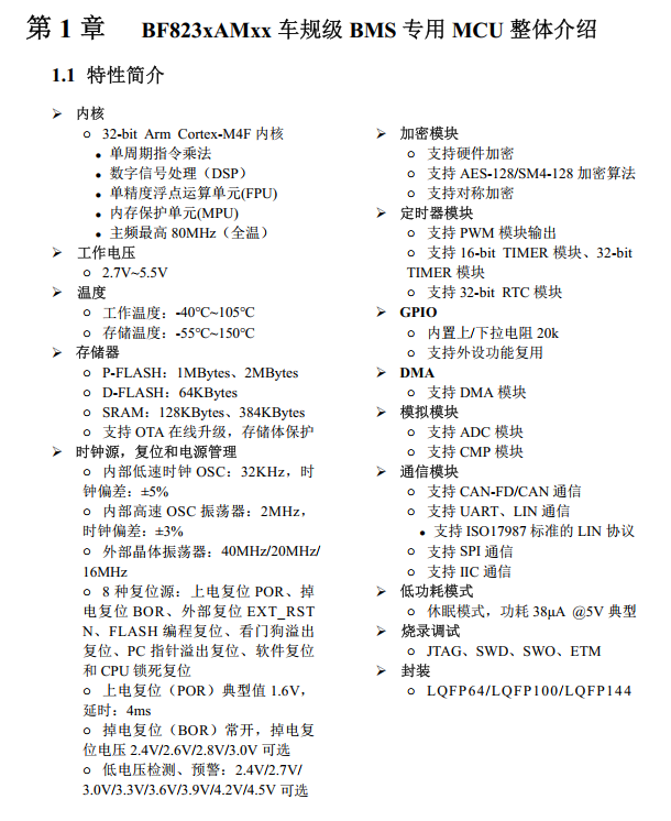 BF823xAMxx 车规级 BMS 专用 MCU 系列采用高性能的 Arm® CortexTM-M4F 的 32 位
